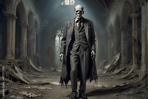 Naklejka premium A skeletal figure in a suit walks through a ruined church.