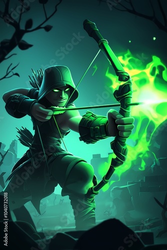 Naklejka premium A skilled archer in a hooded cloak aims with a glowing green bow in a...