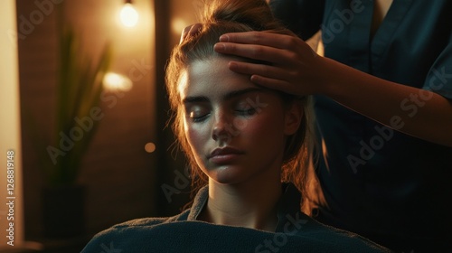 Fototapeta premium A skilled masseuse gently performs a head massage, creating a serene atmosphere. Soft lighting enhances the calming experience in a cozy spa, promoting relaxation and tranquility