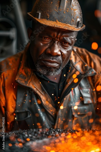 Fototapeta premium A skilled worker focused on his craft in a workshop, surrounded by vibrant sparks and rich textures of metals.