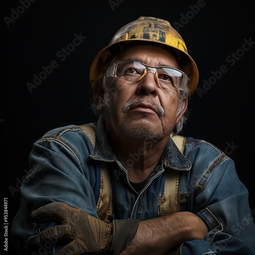 Fototapeta premium A skilled worker gazes thoughtfully, showcasing resilience and dedication in...