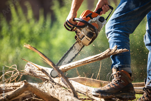 Obraz premium A skilled worker uses a chainsaw to precisely cut logs in a sunny outdoor...