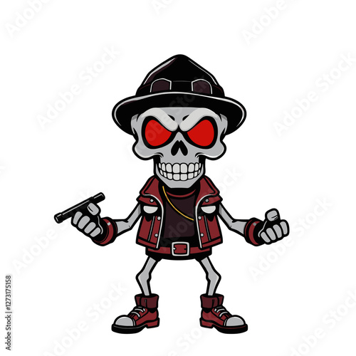 © Business Stock Image, Fototapeta premium a skull emoji wearing a hat, jacket, and shoes, holding a gun in its hand.