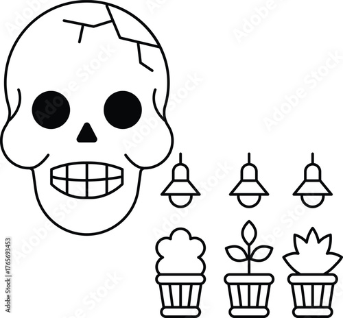 Fototapeta premium A skull is surrounded by a bunch of potted plants