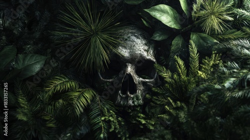 © Sagar, Naklejka premium A skull shrouded in dense greenery, a reminder of nature's embrace.