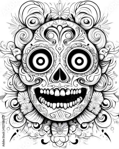© Bonya Sharp Claw, Fototapeta premium A skull with a smile on it. The skull is decorated with flowers and has a very happy expression