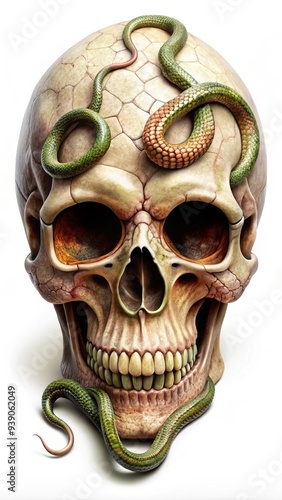 © JH, Fototapeta premium A skull with snake slithering through its eye sockets on a white background