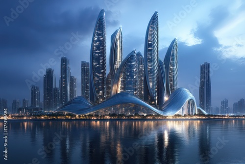 © Aymen, Fototapeta premium A skyline of futuristic, wave-like skyscrapers with glowing edges and serene water reflections below