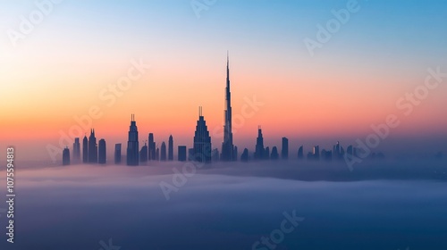 Fototapeta premium A skyline of towering structures breaks through the morning haze, their...