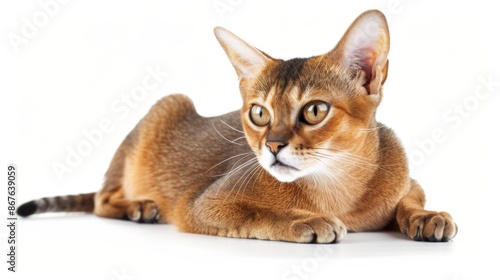 Obraz premium A sleek Abyssinian cat lying on a white backdrop, alert with bright eyes...