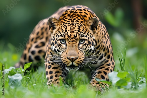© nabakumar, Obraz premium A sleek and agile leopard crouched low in the grass, its spotted coat blending with nature