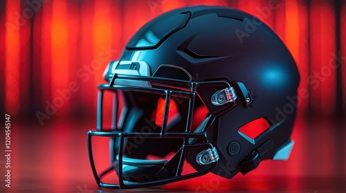 Naklejka premium A sleek black football helmet illuminated by vibrant red and blue lights,...
