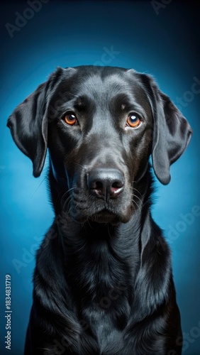 © Pitipat, Fototapeta premium A sleek black labrador dog gives a sassy sideeye gaze on a serene blue background