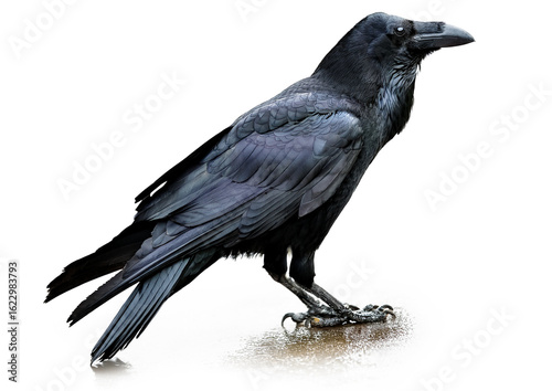 © DIMA RYKOV, Fototapeta premium A sleek black raven stands on a wet surface, its glossy feathers and sharp beak reflecting subtle textures and depth, evoking a sense of wild elegance.