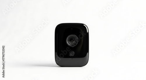 Fototapeta premium A sleek black security camera centered on a white background casting a subtle...
