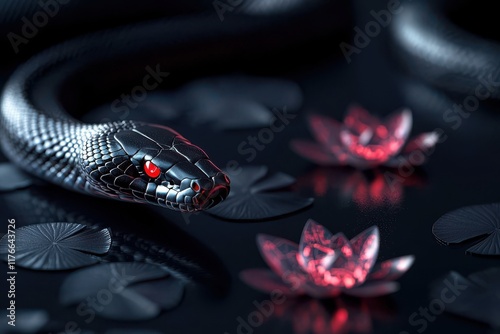 © Wan, Fototapeta premium A sleek black snake with striking red eyes slithers beside vibrant pink water lilies, creating a captivating contrast against a dark background.