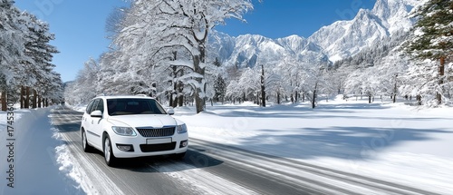 Fototapeta premium A sleek car navigates a snowy road, framed by tall trees and majestic...