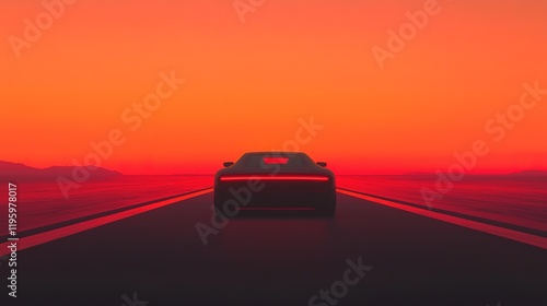 Fototapeta premium A sleek car speeding down a long, open highway with the sun setting on the horizon, illuminating the sky with orange hues