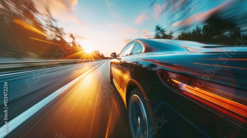 © ChaoticMind, Obraz premium A sleek car speeds down the highway at sunset, with the motion blur effect indicating high speed. The sun setting creates a dramatic and impactful visual effect.