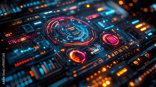 Fototapeta premium A sleek cyberpunk-themed HUD featuring glowing neon holographic panels, detailed grid textures, dynamic motion animations, and vibrant color accents, set against a dark futuristic background,