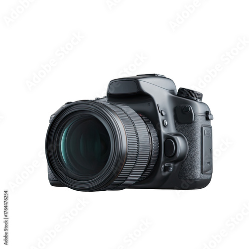 © anak, Fototapeta premium A sleek, dark-grey DSLR camera with a large, professional lens, angled slightly to the right, isolated on a black background