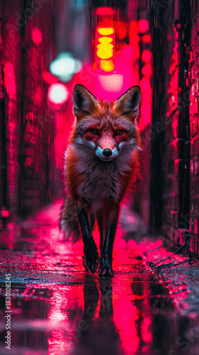 Obraz premium A sleek fox roams a rain-soaked, neon-lit alley, capturing a wild moment in...