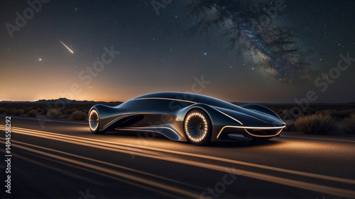 Fototapeta premium A sleek, futuristic car speeds across a desert road under a breathtaking starry night sky.