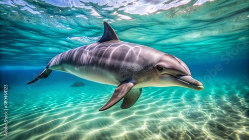 © DigitalArt Max, Obraz premium A sleek gray dolphin swims solo, its curved dorsal fin and playful tail slicing through calm turquoise waters beside bubbles.