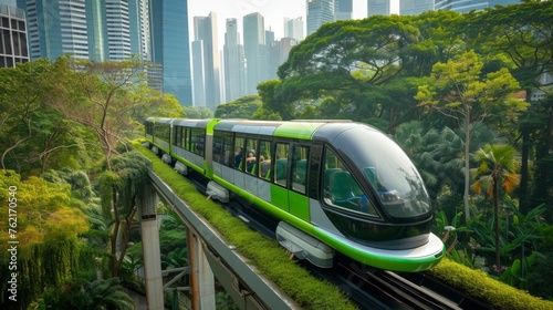 Fototapeta premium A sleek, green monorail train glides through a verdant cityscape, showcasing a harmonious blend of modern transportation and lush greenery in an eco-friendly urban environment.