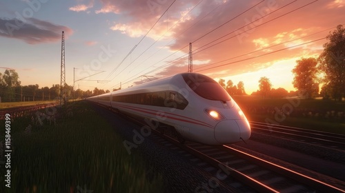 © Natchooda, Fototapeta premium A sleek high-speed train speeding along the railway tracks, with a beautiful sunset sky and forest in the background, evoking motion and natural beauty