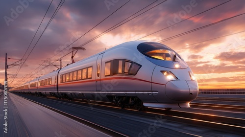 © mila103, Naklejka premium A sleek high-speed train speeds down the railway tracks during sunset. The sky is filled with hues of orange and purple as the sun sets on the horizon casting a warm glow.