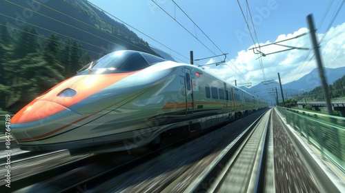 © admin_design, Fototapeta premium A sleek, high-speed train speeds through a mountain pass, its silver and orange paint shimmering in the sun.