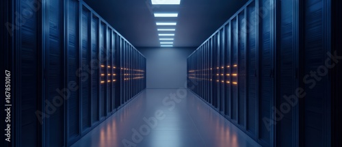 © watcharee, Fototapeta premium A sleek, high-tech data center corridor lined with server racks, illuminated by overhead lights, showcasing a modern computing environment.