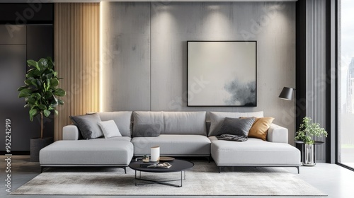 Fototapeta premium A sleek L-shaped sofa in a modern living room, complemented by tasteful wall...