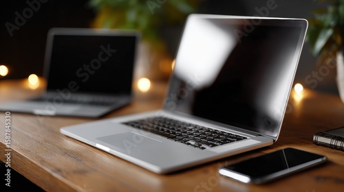 Fototapeta premium A sleek laptop and smartphone on a wooden desk, surrounded by warm lighting,...