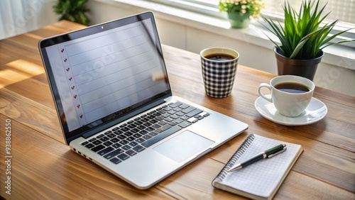 Fototapeta premium A sleek laptop on a clutter-free desk with a checked to-do list and a cup of...