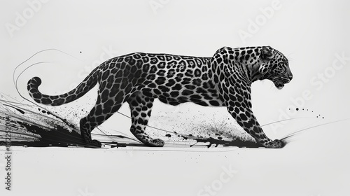 Fototapeta premium A sleek leopard, mid-prowl, is depicted in bold black strokes on a white canvas