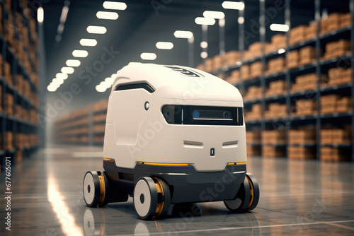 Naklejka premium A sleek, Minimalist mobile robot navigation a warehouse.