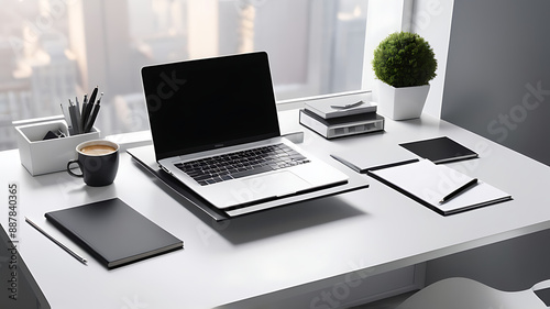 © Riteek, Fototapeta premium A sleek, minimalist office desk with a laptop, a cup of coffee, and some neatly arranged stationery, set against a contemporary office backdrop