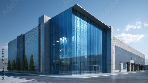 © Babb, Fototapeta premium A sleek modern commercial building showcases a large glass facade under a clear blue sky.