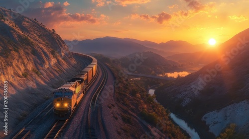 Fototapeta premium A sleek, modern freight train winding through a mountain pass at sunset,...