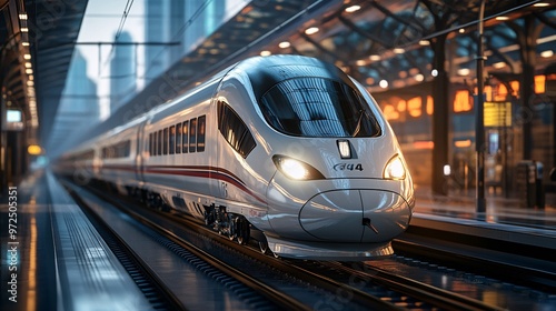 © Jiraphat, Fototapeta premium A sleek, modern high-speed train arriving at a bustling urban station, showcasing advanced technology and contemporary design.