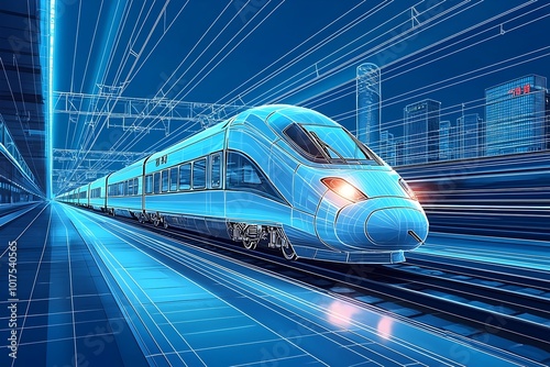 Naklejka premium A sleek, modern high-speed train speeds through a futuristic cityscape, leaving a trail of blue lines in its wake.