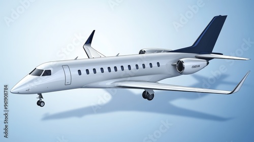 © Aris Suwanmalee, Obraz premium A sleek, modern jet aircraft designed for luxury travel, showcasing its streamlined shape against a light blue background.