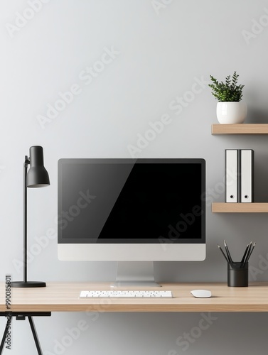 Obraz premium A sleek, modern office space featuring a wooden desk, a desktop computer, and...