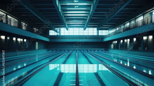 Fototapeta premium A sleek, modern Olympic pool with sparkling turquoise water and empty lanes, surrounded by silent spectator stands,