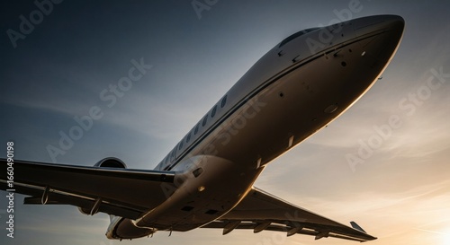 © Ace13, Obraz premium A sleek, modern private jet ascends into a dramatic sky, showcasing its aerodynamic design and powerful engines against the setting sun.