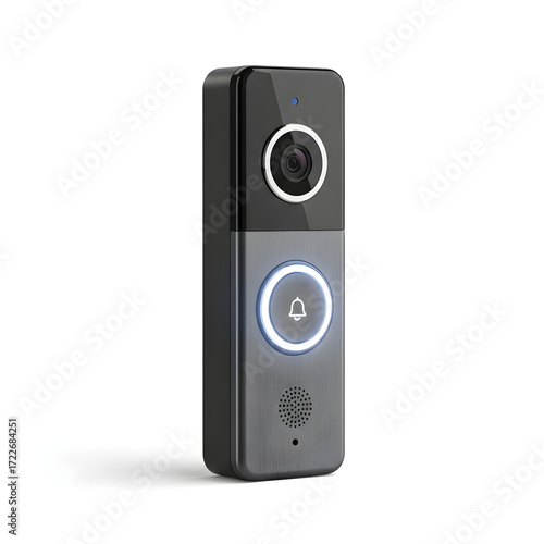 Fototapeta premium A sleek, modern smart doorbell with a camera and illuminated button, designed...