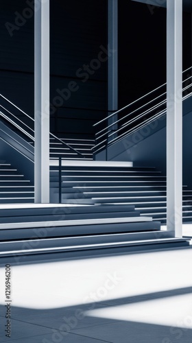 © Sergey, Obraz premium A sleek, modern staircase with sharp lines and ambient lighting, creating a futuristic atmosphere in a minimalist architectural setting.