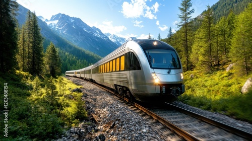 Fototapeta premium A sleek, modern train travels alongside a lush green valley, surrounded by majestic mountains, reflecting an adventurous spirit of exploration and nature's beauty.